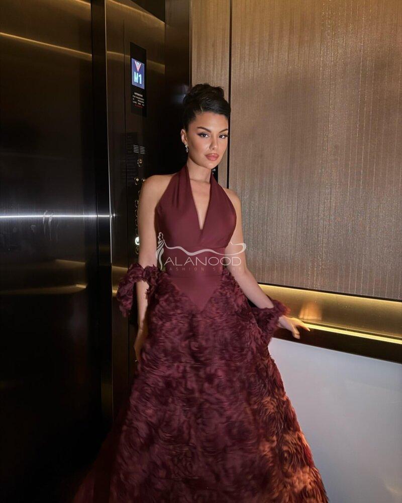 - الألوان: الفستان يأتي بلون عودي عميق وجذاب، يعكس ذوقك الرفيع ويبرز جمالك.