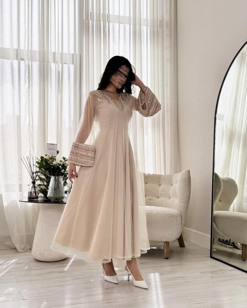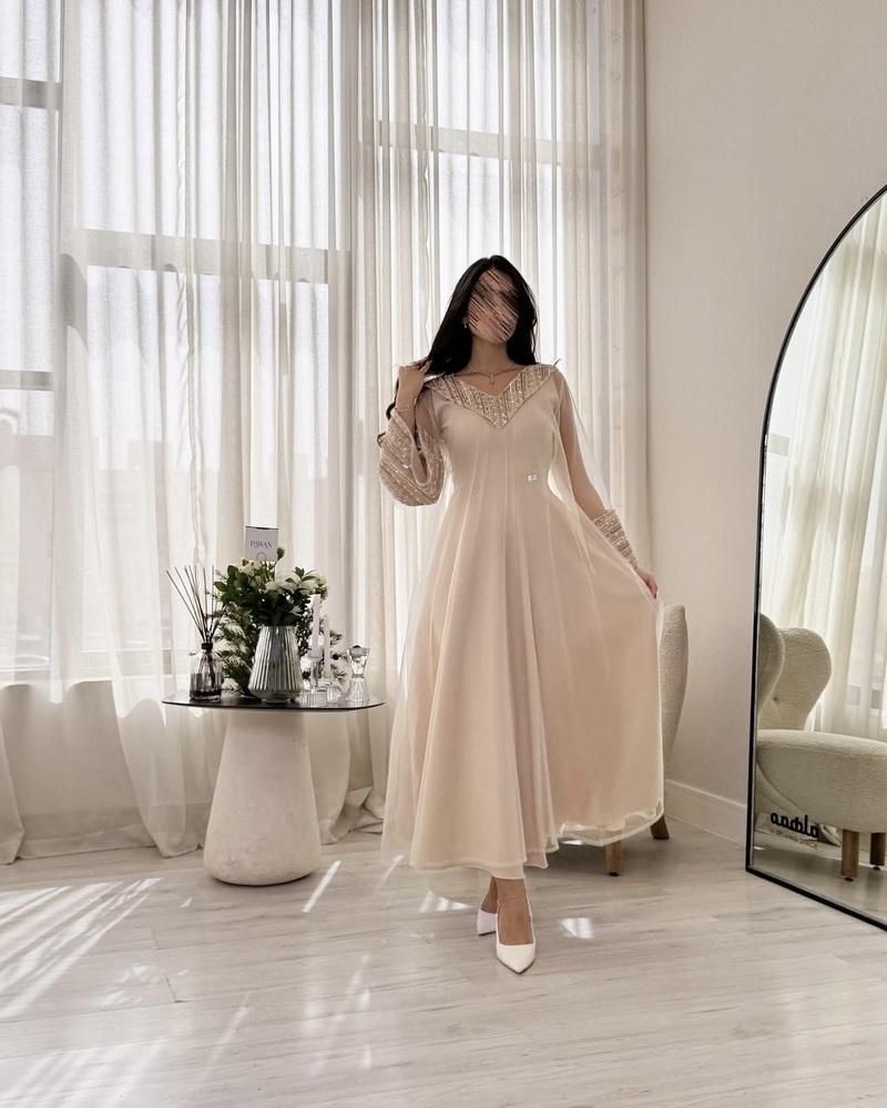 - الألوان: يأتي الفستان بلون بيج فاتح دافئ يعكس ذوقك الرفيع.