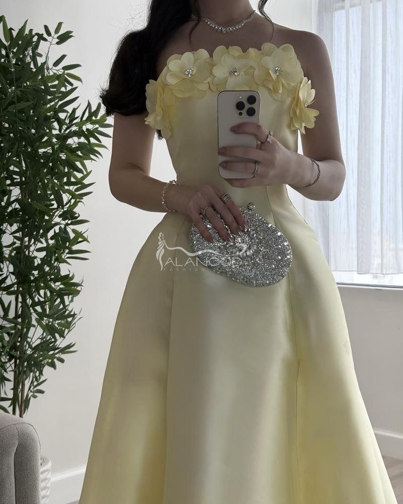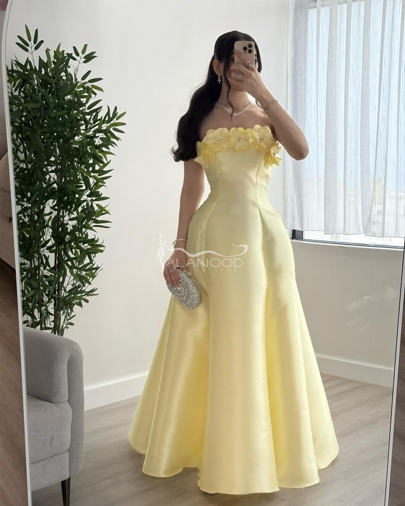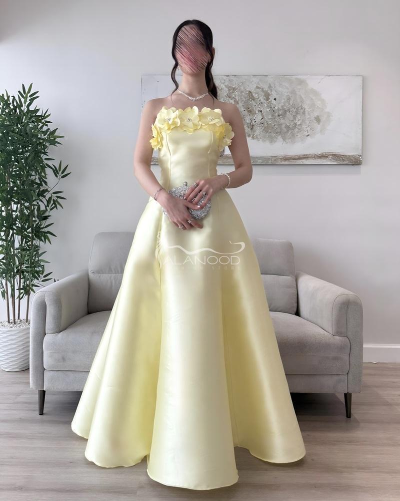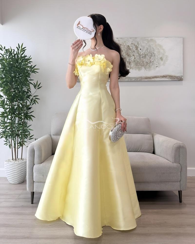 • الألوان: يتمتع الفستان بلون اصفر مشرق يجذب الأنظار، مما يضفي لمسة من الفخامة والجاذبية.