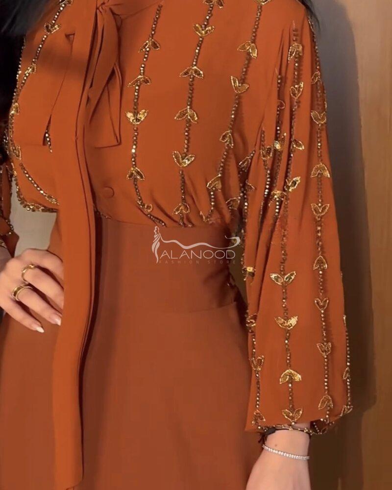 - التفاصيل الدقيقة: كل تفصيل في الفستان مصمم بعناية، مما يعكس جودة الحرفية والاهتمام بالتفاصيل.