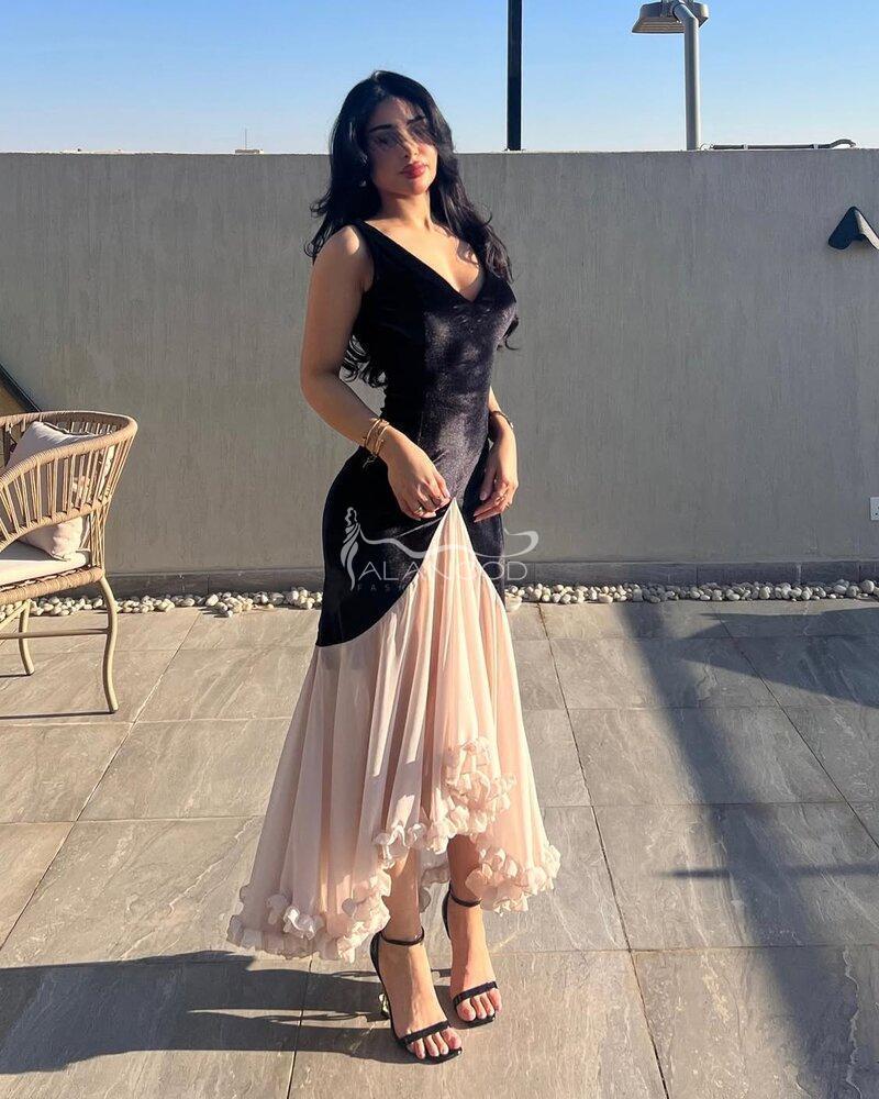 - الألوان: الفستان يأتي بلونين الأسود ولحمي يعكس ذوقك الرفيع ويبرز جمالك.