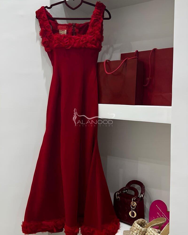 تم تصنيع فستان ميدي أحمر من خامة فاخرة وناعمة على البشرة، مما يضمن لك الراحة طوال اليوم. تصميمه الأنيق مع قصّة ضيقة من الأعلى تتسع تدريجياً نحو الأسفل، يبرز جمال قوامك بشكل مثالي. الفستان مزين بكلفة متقنة، تضيف لمسة فاخرة تجعلك محط الأنظار في أي احتفال.