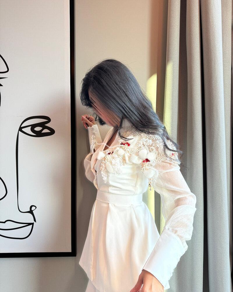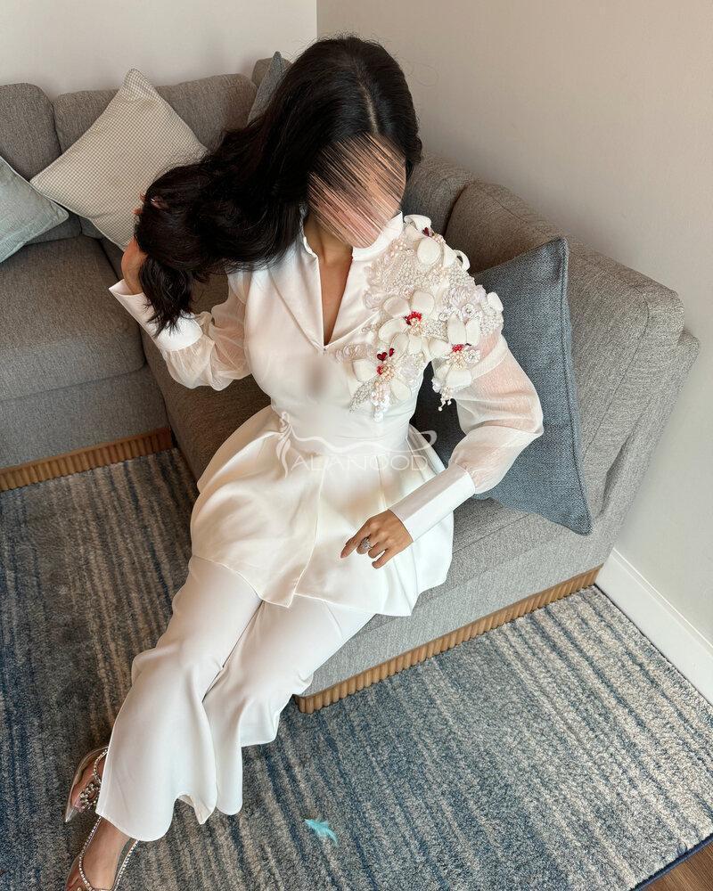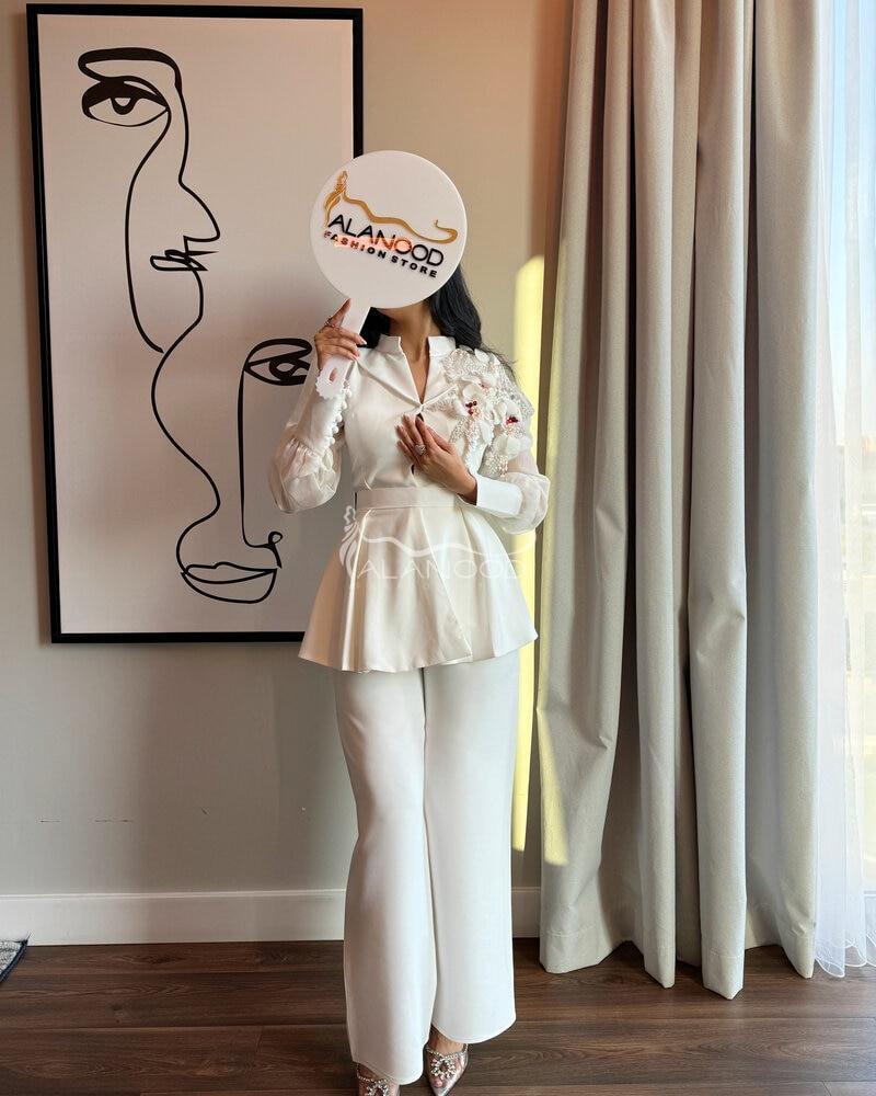 مصنوع من خامة ملكية ذات جودة عالية، يوفر هذا الجمبسوت ملمسًا ناعمًا ومريحًا على البشرة، مما يجعله مثاليًا للارتداء طوال اليوم. تصميمه الجذاب يبرز جمالك الطبيعي، حيث يتميز بأكمام مزينة بتفاصيل دقيقة تضيف لمسة فاخرة.