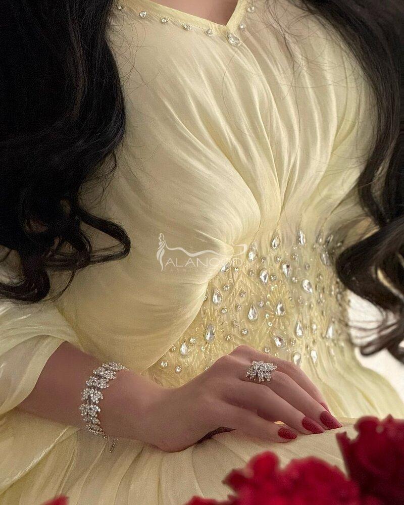 - اللون: يأتي الفستان بلون أصفر فاتح، مما يجعله خيارًا مثاليًا لإبراز جمالك.