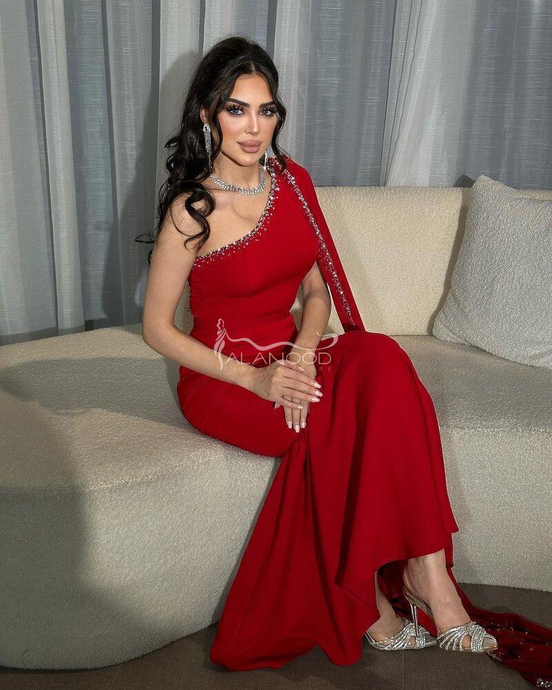 فستان أحمر ناعم بكلفة مطرزة فاخرة